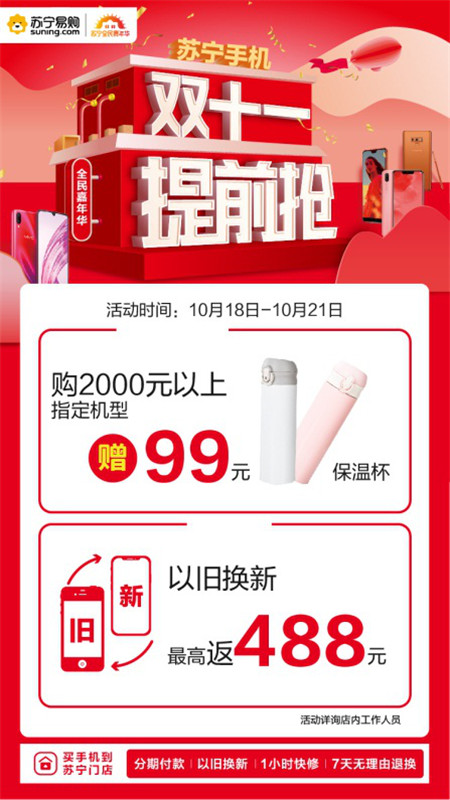 本次蘇寧手機(jī)“雙十一提前搶”活動(dòng),主要針對以舊換新業(yè)務(wù),活動(dòng)期間在蘇寧易購門店通過以舊換新購買新機(jī),最高可返488元,同時(shí)購買2000元以上的指定機(jī)型,還可獲得獲贈(zèng)保溫杯等各種禮品。