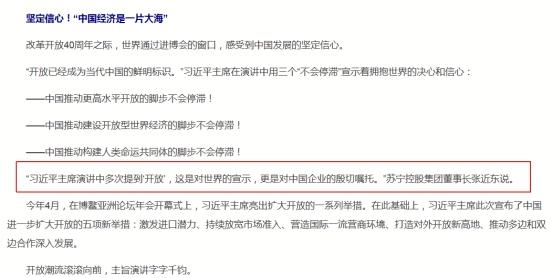 在聆聽(tīng)主旨演講后,蘇寧當(dāng)家人張近東感慨:“隨著中國(guó)改革開(kāi)放進(jìn)程的不斷深化,蘇寧在海外市場(chǎng)的合作效率會(huì)越來(lái)越高、合作規(guī)模會(huì)越來(lái)越大!