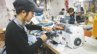將白色寬邊松緊帶折進(jìn)布條,疊好后放到褲腰位置,在五線鎖邊機(jī)下轉(zhuǎn)一圈,15秒不到,一個(gè)褲腰上好。不一會兒,謝藍(lán)珍就將手邊的20條童褲整理好,拿到拉腰機(jī)前鎖邊、壓線。她告訴記者,再壓下褲腳,今天的生產(chǎn)任務(wù)就算完成了。另一套機(jī)器旁,她的丈夫余效柱正在做最后的褲腳活兒!白鲆徽容^好,不膩。在流水線上只做一個(gè)環(huán)節(jié)太單調(diào)了!敝x藍(lán)珍說。
