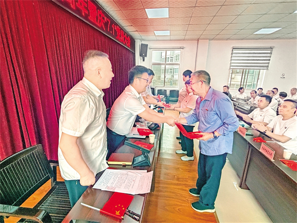 6月26日上午,嵐皋縣城關(guān)鎮(zhèn)西坡社區(qū)黨組織為黨齡滿50年的3名老黨員頒發(fā)“光榮在黨50年”紀(jì)念章,給每名參會(huì)黨員送上“政治生日賀卡”。魏代續(xù) 廖霖 攝