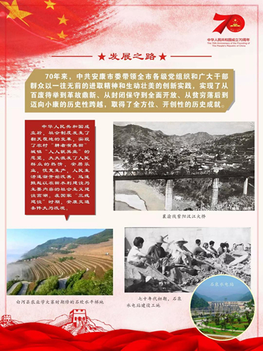 滿懷豪情圖說盛世,光影定格美好記憶。成就展分為崢嶸歲月、安康巨變、黨旗飄飄3個部分,以豐富的資料、精美的圖片、詳實的數(shù)據(jù),從不同時期、不同角度記錄了全市人民在中省領(lǐng)導(dǎo)的關(guān)懷下,不甘落后、求實創(chuàng)新的足跡,展示了70年來,特別是黨的十八大以來,在習(xí)近平新時代中國特色社會主義思想指引下,統(tǒng)籌推進“五位一體”總體布局,協(xié)調(diào)推進“四個全面”戰(zhàn)略布局,全市經(jīng)濟建設(shè)、政治建設(shè)、文化建設(shè)、社會建設(shè)、生態(tài)文明建設(shè)和黨的建設(shè)取得的顯著成就。