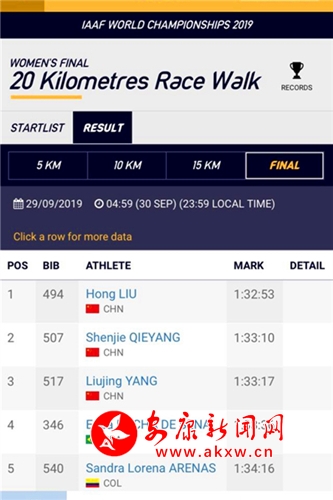 本報訊(記者 魏濤 通訊員 章理)9月30日,在2019年多哈田徑世錦賽女子20公里競走決賽中,中國隊包攬前三名。現(xiàn)世界紀錄保持者劉虹以1小時32分53秒獲得冠軍;名將切陽什姐獲得亞軍,安康籍運動員楊柳靜以1小時33分17秒獲得季軍,這是中國田徑隊歷史上第一次在世錦賽單項目上包攬前三。