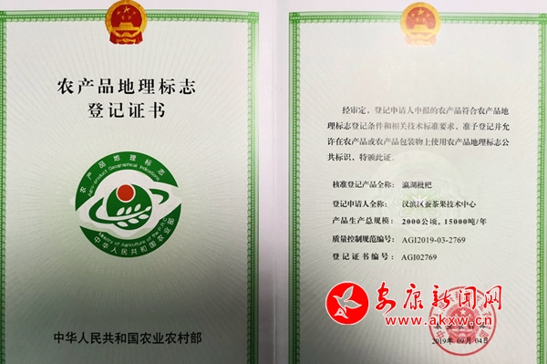 日前,農(nóng)業(yè)農(nóng)村部發(fā)布公告,漢濱區(qū)農(nóng)業(yè)農(nóng)村局蠶茶果技術中心申報的“瀛湖枇杷”經(jīng)過初審、專家評審和公示,符合農(nóng)產(chǎn)品地理標志登記條件和相關技術標準要求,準予登記,特頒發(fā)中華人民共和國農(nóng)產(chǎn)品地理標志登記證書。