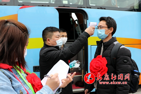 記者在現(xiàn)場看到,前來乘車的務(wù)工人員都戴了口罩,而且在上車之后,醫(yī)護人員還逐一量了體溫,以確保每位人員身體健康。“前期我們在對農(nóng)村勞動力摸排過程中,首先是向他們宣傳疫情防控的知識,對有外出務(wù)工需求的人員,我們會對其進行體檢,幫助他們完善身體健康的證明資料。今天在現(xiàn)場又進行一次體檢,同時車上還有專門工作人員每隔4小時為他們量體溫,以此來確保輸出務(wù)工人員的健康安全。” 漢濱區(qū)人力資源和社會保障局負責(zé)人魏東鵬介紹。