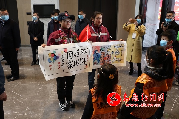 在高新國(guó)際會(huì)議中心大門(mén)入口的臺(tái)階上,三所市級(jí)醫(yī)院的醫(yī)護(hù)人員、市民群眾列起長(zhǎng)隊(duì),喊著口號(hào),夾道歡迎英雄回家。進(jìn)入大廳,孩子們紛紛獻(xiàn)上自己的畫(huà)作,表達(dá)對(duì)援鄂英雄的敬意。