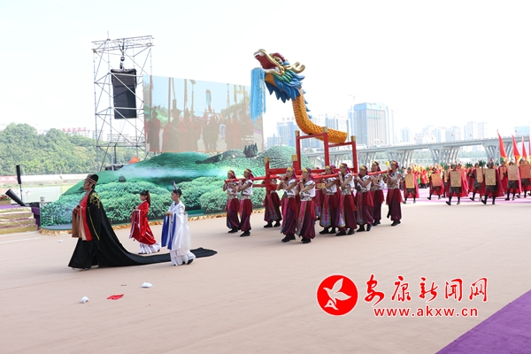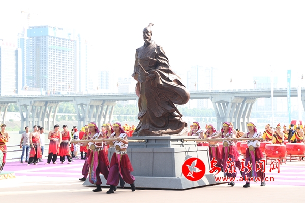 “緬懷先賢”隨著主祭官一聲令下,百名少年兒童方陣,著漢服,持竹簡(jiǎn),緩緩步入舞臺(tái),在悠揚(yáng)婉轉(zhuǎn)的古箏聲中,齊聲吟誦祭文。在全場(chǎng)目光的注視下,愛(ài)國(guó)詩(shī)人屈原塑像被九位壯漢護(hù)送至舞臺(tái)正中。在主祭官的引導(dǎo)下,眾人向屈原塑像鞠躬叩首,并將粽子投入江中,以示對(duì)先賢的敬畏與追思。