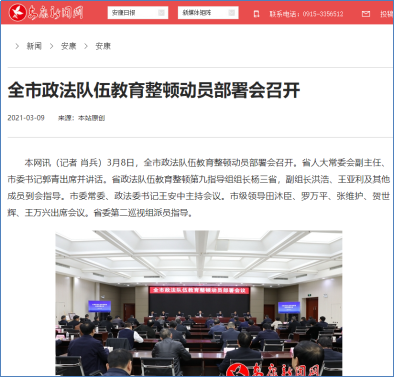 本網(wǎng)訊(記者 張世虎)3月8日,我市政法隊(duì)伍教育整頓動(dòng)員部署會(huì)召開(kāi)。省人大常委會(huì)副主任、市委書(shū)記郭青出席并講話。3月9日,安康舉行了政法隊(duì)伍教育整頓第一次新聞發(fā)布會(huì),得到中省市媒體高度關(guān)注和集中報(bào)道。