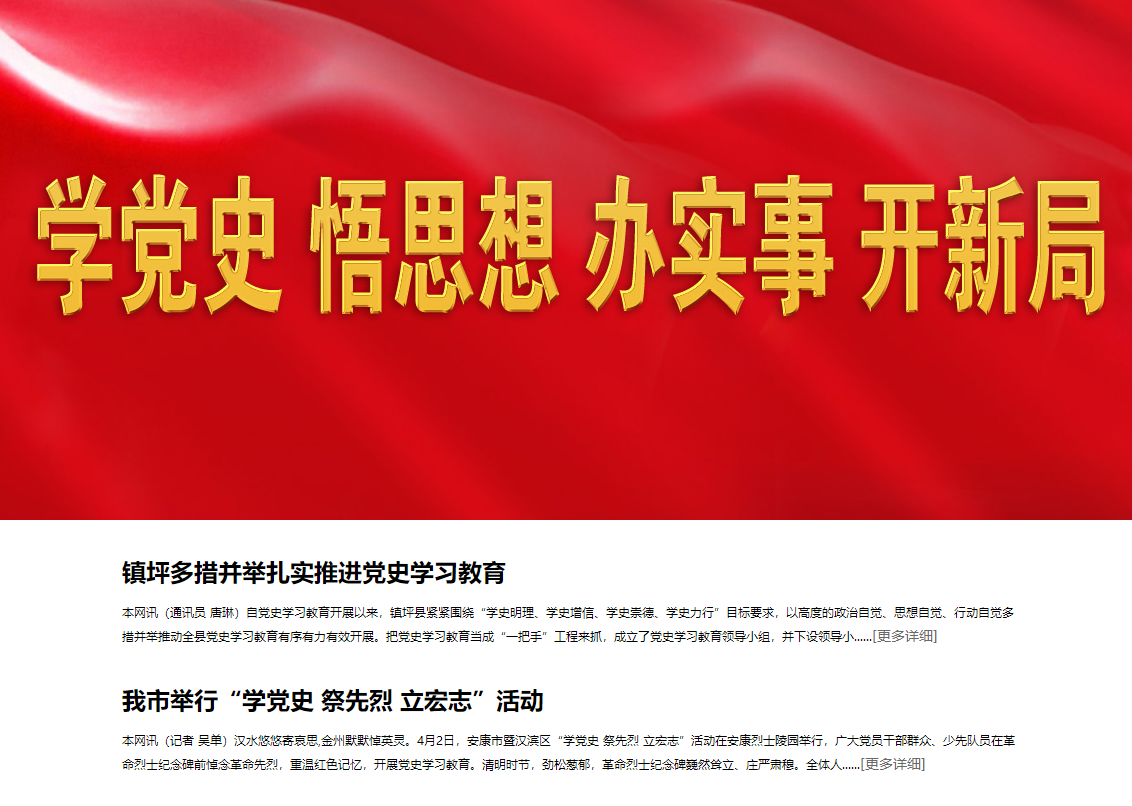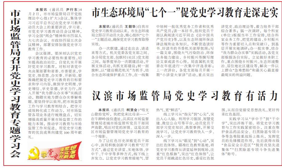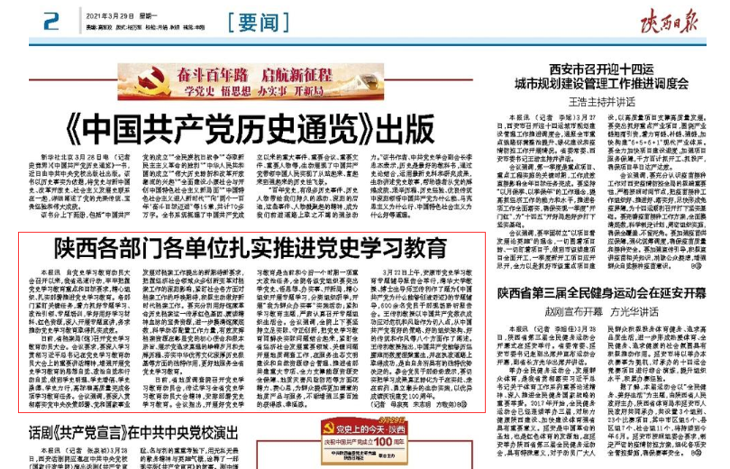 3月29日以來(lái),《陜西日?qǐng)?bào)》以《全省各部門各單位扎實(shí)推進(jìn)黨史學(xué)習(xí)教育》為題,對(duì)我市舉行首場(chǎng)黨史學(xué)習(xí)教育專題報(bào)告會(huì)進(jìn)行了報(bào)道。緊接著,“學(xué)習(xí)強(qiáng)國(guó)”推出了《陜西安康市漢濱區(qū):忠魂千秋耀山鄉(xiāng) 慷慨奮進(jìn)著新篇》《激戰(zhàn)牛蹄嶺 碧血映山河》兩篇報(bào)道。陜西廣播電視臺(tái)、群眾新聞網(wǎng)、西部網(wǎng)集中播出我市策劃拍攝的《繼承廖乾五的革命精神 凝聚起百年奮進(jìn)新征程強(qiáng)大力量》的主題報(bào)道!妒形N嘧釉谂L銕X開展黨史學(xué)習(xí)教育》視頻新聞被新華網(wǎng)、陜西法制網(wǎng)轉(zhuǎn)載。
