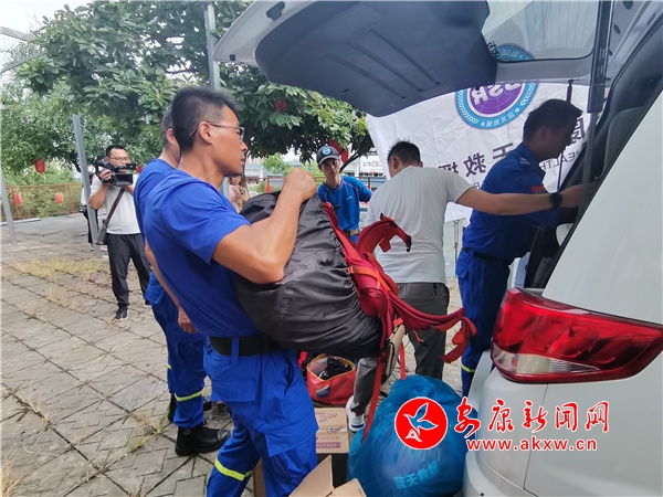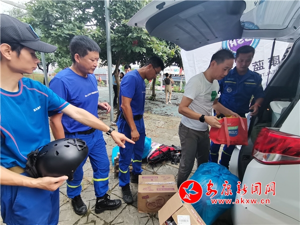 浮力馬甲、頭盔、拋繩包、50米繩、30米繩、急救包、固定板、太陽燈……準備現(xiàn)場,隊員們逐一認真核對所攜帶的救援裝備,不時有志愿者送來捐贈的生活用品。