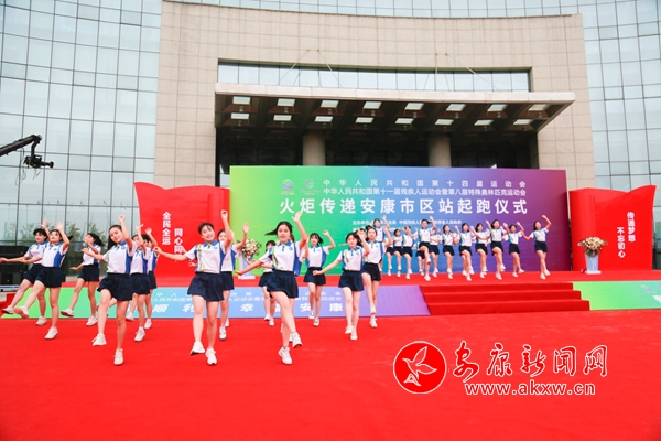 暖場(chǎng)節(jié)目漢劇歌舞《春色滿園樂安康》和安康高新中學(xué)學(xué)生表演的健身操《天天向上》,點(diǎn)燃了現(xiàn)場(chǎng)喜慶的氣氛。上午8時(shí),火炬?zhèn)鬟f起跑儀式正式開始。4名國(guó)旗護(hù)衛(wèi)禮兵高舉中華人民共和國(guó)國(guó)旗,邁著整齊有力的步伐進(jìn)入儀式現(xiàn)場(chǎng),全場(chǎng)齊聲同唱《中華人民共和國(guó)國(guó)歌》,嘹亮的旋律激蕩人心、催人奮進(jìn)。