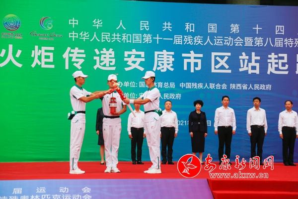 省殘疾人聯(lián)合會(huì)理事長(zhǎng)、殘?zhí)貖W會(huì)組委會(huì)執(zhí)行副秘書長(zhǎng)相紅霞,市委書記、十四運(yùn)會(huì)和殘?zhí)貖W會(huì)安康市執(zhí)委會(huì)主任趙俊民,市委副書記、市長(zhǎng)武文罡,原陜西省南水北調(diào)辦公室主任、十四運(yùn)會(huì)和殘?zhí)貖W會(huì)場(chǎng)館建設(shè)部駐會(huì)副部長(zhǎng)朱昱,省生態(tài)環(huán)境廳二級(jí)巡視員、十四運(yùn)會(huì)和殘?zhí)貖W會(huì)組委會(huì)環(huán)境治理部駐會(huì)副部長(zhǎng)王文,市委常委、宣傳部部長(zhǎng)羅雪劍出席火炬?zhèn)鬟f起跑儀式;鹁?zhèn)鬟f起跑儀式由副市長(zhǎng)、十四運(yùn)會(huì)和殘?zhí)貖W會(huì)安康市執(zhí)委會(huì)副主任楊淼主持。