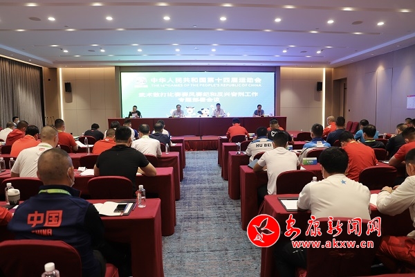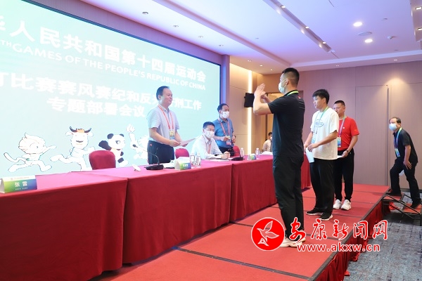 會(huì)議傳達(dá)學(xué)習(xí)了《體育總局辦公廳關(guān)于印發(fā)<第十四屆全國(guó)運(yùn)動(dòng)會(huì)賽風(fēng)賽紀(jì)違規(guī)處罰規(guī)定>的通知》;宣讀了《第十四屆全運(yùn)會(huì)武術(shù)散打決賽運(yùn)動(dòng)隊(duì)賽風(fēng)賽紀(jì)和反興奮劑工作責(zé)任書(shū)》、《第十四屆全國(guó)運(yùn)動(dòng)會(huì)武術(shù)散打決賽領(lǐng)隊(duì)、教練員參賽承諾書(shū)》。