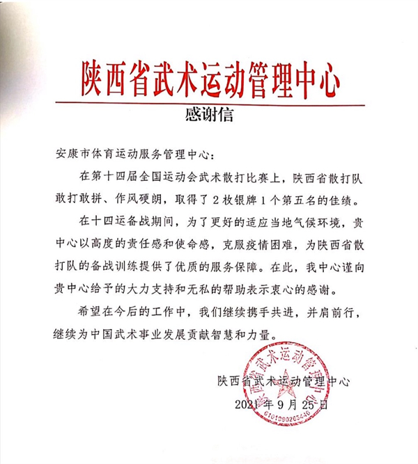 本網(wǎng)訊 9月25日,陜西省武術運動管理中心向我市發(fā)來感謝信,對安康為陜西省散打隊備戰(zhàn)十四運會的訓練提供了優(yōu)質(zhì)的服務保障表示謝意。