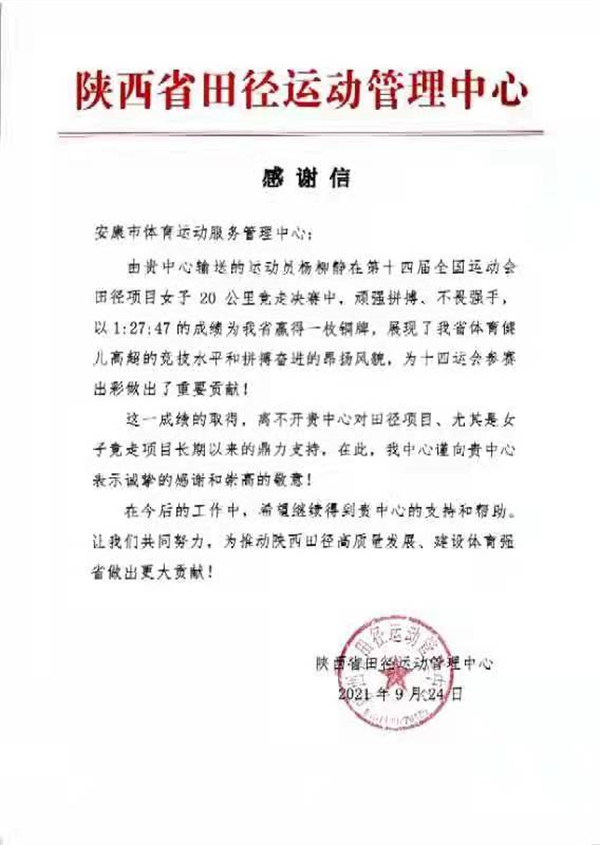 據(jù)了解,由安康市體育中心輸送的安康籍運動員楊柳靜在第十四屆全運會田徑項目女子競走20公里決賽中為陜西省贏得一枚銅牌。感謝信中寫道:“希望雙方共同努力,為推動陜西田徑高質量發(fā)展,建設體育強省做出更大貢獻!”F4h安康新聞網(wǎng)