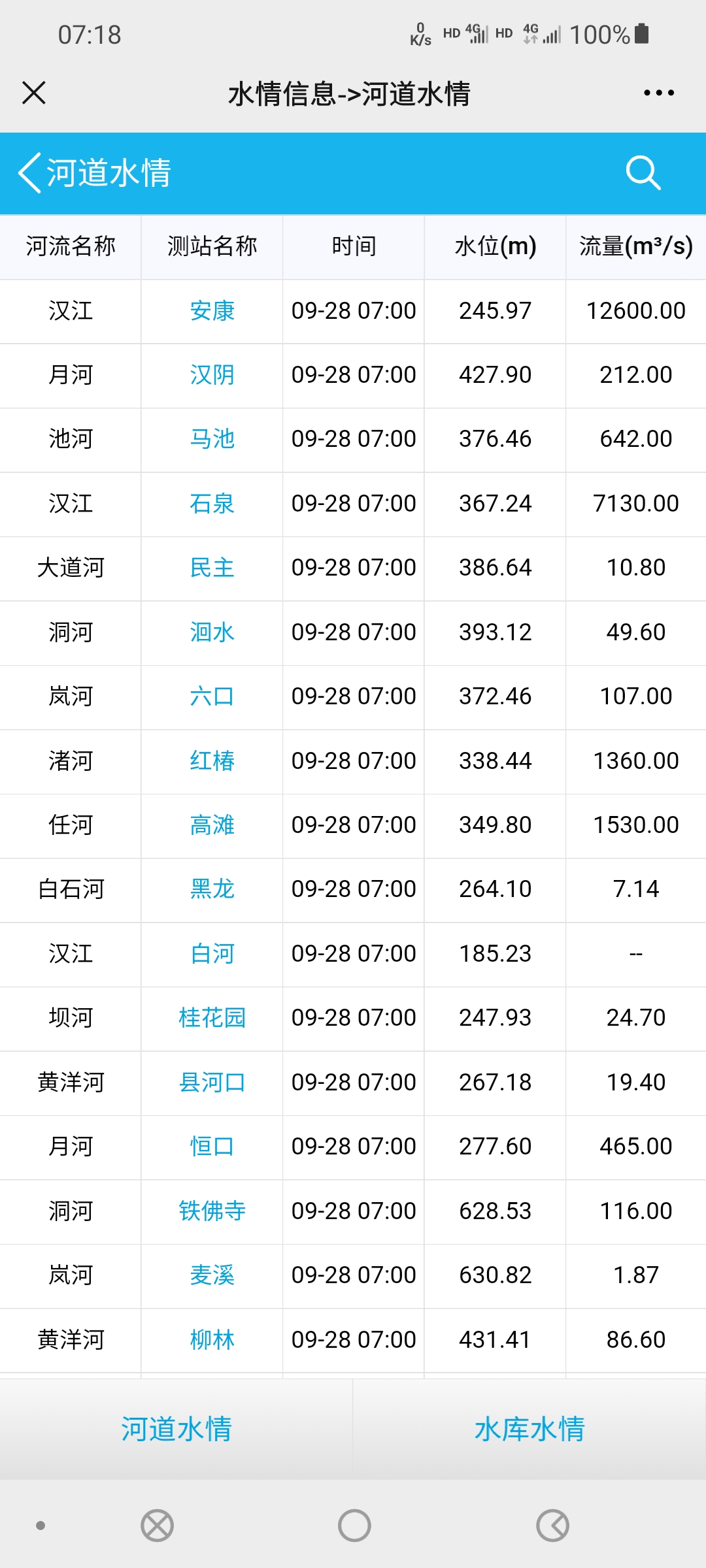 截至9月28日7時(shí),漢江水位(安康測(cè)站)245.97m,流量12600.00m³/s。
