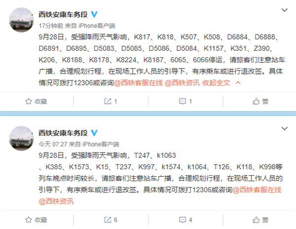 又訊:9月28日,受強(qiáng)降雨天氣影響,K817、K818、K507、K508、D6884、D6888、D6891、D6895、D5083、D5085、D5086、D5084、K1157、K351、Z390、K206、K8188、K8178、K8224、K8187、6065、6066停運(yùn)。