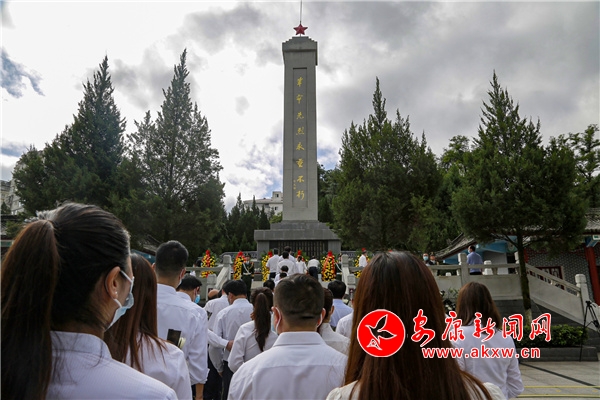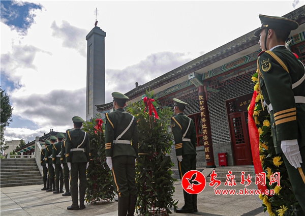 隨后,《獻(xiàn)花曲》奏響,禮兵列隊(duì)入場,將花籃整齊擺放在紀(jì)念碑基座上。趙俊民拾級而上緩步行至紀(jì)念碑前,仔細(xì)整理花籃緞帶,全體人員向革命烈士三鞠躬,表達(dá)緬懷之情。參加活動的市級領(lǐng)導(dǎo)和各界代表也依次敬獻(xiàn)鮮花并瞻仰烈士紀(jì)念碑。