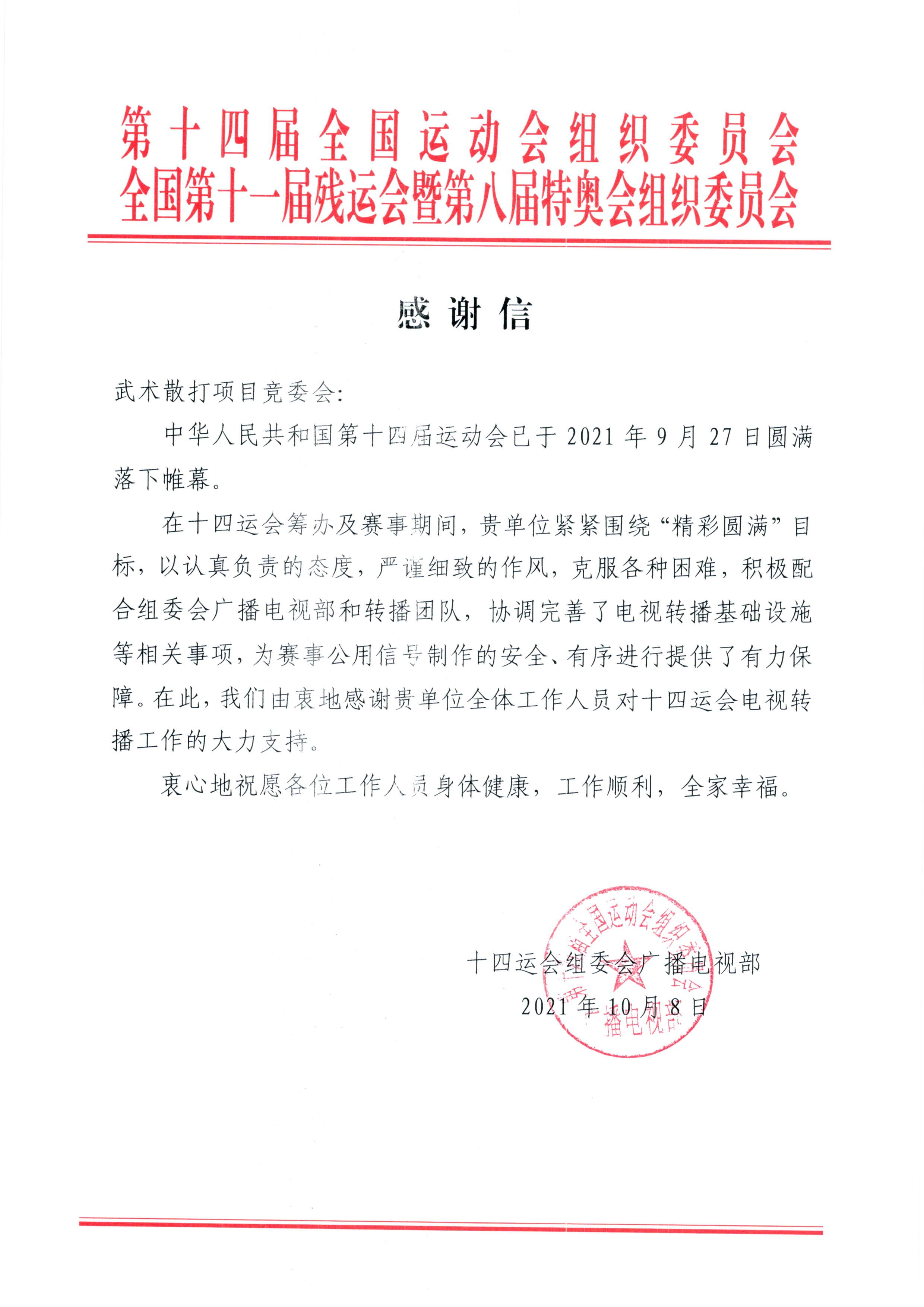 十四運會組委會廣播電視部在信中寫道:“緊緊圍繞‘精彩圓滿’目標(biāo),以認真負責(zé)的態(tài)度,嚴謹細致的作風(fēng),克服各種困難,積極配合組委會廣播電視部和轉(zhuǎn)播團隊,協(xié)調(diào)完善了電視轉(zhuǎn)播基礎(chǔ)設(shè)施等相關(guān)事項,為賽事公用信號制作的安全、有序提供了有力保障。”