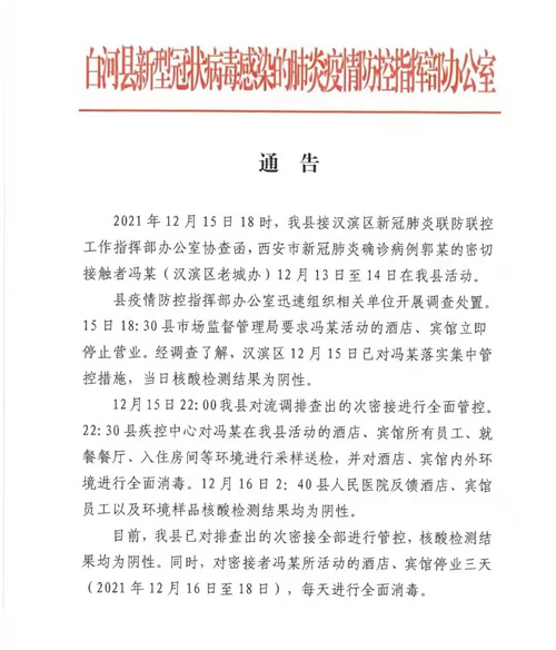目前,我縣已對排查出的次密接全部進行管控,核酸檢測結果均為陰性。同時,對密接者馮某所活動的酒店、賓館停業(yè)三天(2021年12月16日至18日),每天進行全面消毒。