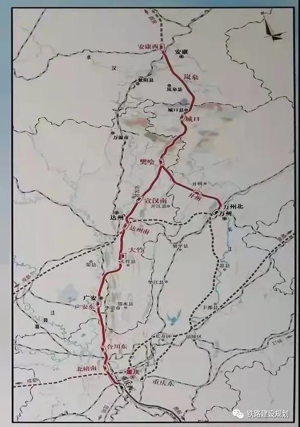 項目起自在建西安至安康高速鐵路安康西站,經嵐皋、城口、宣漢、達州、大竹、廣安、合川、北碚,至重慶樞紐重慶西站,線路全長477.9公里(其中新建線路446.7公里),設11座車站;同步建設樊噲經開州至萬州連接線,長90.2公里,設3座車站。配套新建本線至蘭渝鐵路、襄渝鐵路、成達萬高鐵聯(lián)絡線約26公里。