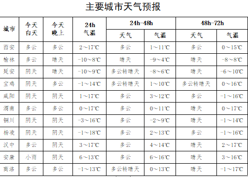 今天晚上:陜北、關中多云轉(zhuǎn)晴天,陜南陰天轉(zhuǎn)多云,南部局地有小雨。日平均氣溫陜北黃河沿線、關中中東部下降4℃左右。