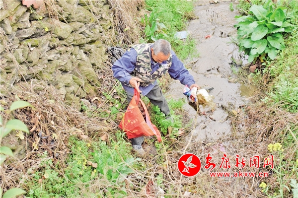 “我前兩天看溝里石頭堆中間有一件被丟掉的衣服,得趕緊撈出來,可不敢等到春天雨水多了。”李輝智回頭對章彩云說,“那是的,現(xiàn)在溝里干凈著呢,我一會兒回家找個長竹竿把衣服勾出來,不能讓這些影響了水質(zhì)。”章彩云回應(yīng)道。
