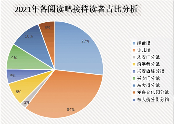 2021年,接待人數(shù)最多的閱讀場館也是少兒館,接待人數(shù)147188人次,占全年接待讀者總?cè)藬?shù)的34%。借閱排行榜的前20名均為少兒圖書,其中楊紅櫻所著《笑貓日記·藍色的兔耳朵草》全年借閱次數(shù)達到97次。這表明,隨著雙減政策的落地和少兒閱讀積分存折、親子閱讀等少兒閱讀推廣活動的開展,極大地調(diào)動了少兒群體的閱讀積極性,圖書館正逐漸成為學生群體課余生活的新選擇。