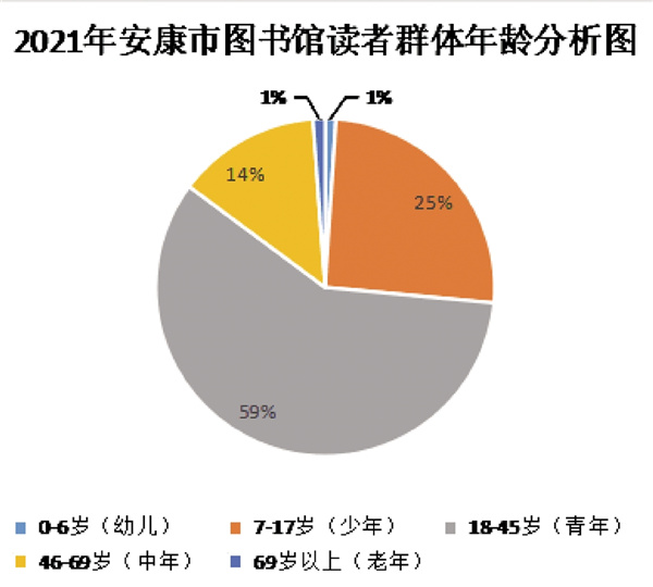 從讀者年齡段來看,市圖書館2021年有幼兒讀者(0-6歲)324人,少兒讀者(7-17歲)8098人,青年讀者(18-45歲)18686人,中年讀者(45-69歲)4347人,老年讀者(69歲以上)366人。讀者群體中青年讀者占比最大,占讀者群體的59%。少年讀者和青年讀者仍是圖書館的主要服務對象,總占比達到84%。