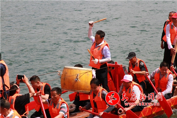 上午10時(shí)許,龍舟文化園禮炮轟鳴,數(shù)百健兒痛快地飲下“摔碗酒”,隨后依次登上自己隊(duì)伍的龍舟。紅色、黃色、紫色的龍舟整齊劃一地?吭诮,龍頭高昂,龍尾高翹,槳櫓浮動(dòng),旗幟飄揚(yáng)。聞聲而來的群眾齊聚兩岸,駐足圍觀。總指揮一聲哨響,木槳齊動(dòng),龍舟似箭掠過無垠江面直逼江心,留下層層白浪;一艘艘或逆流勇進(jìn),或順流而下,或徑直橫渡,瞬間點(diǎn)燃觀眾激情,不時(shí)引得大家齊聲吶喊。號(hào)子聲、鑼鼓聲、吶喊聲、歡呼聲,此起彼伏,聲聲震天。隊(duì)員們跟隨著鼓點(diǎn)賣力地劃槳,舵手隨著龍舟行進(jìn)的方向不停調(diào)整把舵,龍舟的速度不斷加快,再快,更快。