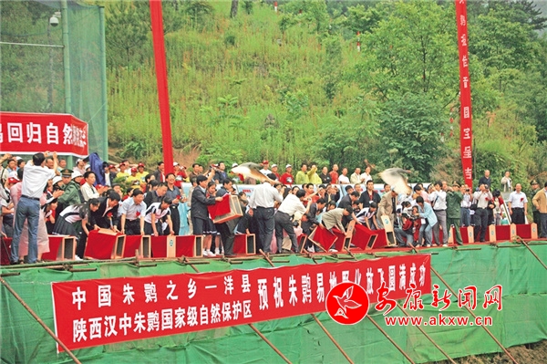 2007年5月31日,中國(guó)陜西朱鹮野化放飛儀式正式在寧陜縣寨溝村舉行。中省領(lǐng)導(dǎo)出席了放飛儀式,并打開(kāi)鳥籠,一起放飛了20只朱鹮,隨后,放飛基地的技術(shù)人員、寧陜縣的群眾代表和學(xué)生代表又放飛6只。隨著放飛的朱鹮翱翔藍(lán)天,標(biāo)志著朱鹮保護(hù)由單純的人工搶救開(kāi)始轉(zhuǎn)向回歸自然的新階段,朱鹮搶救保護(hù)的歷史掀開(kāi)了新的一頁(yè)。