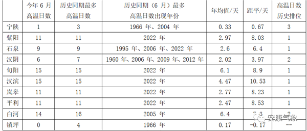 全市除寧陜、鎮(zhèn)坪外,其余各縣(區(qū)、市)高溫日出現(xiàn)6至15天不等,其中旬陽、漢濱高溫日數(shù)最多為15天,其中漢濱高溫日數(shù)較同期平均偏多10天左右;全市高溫日數(shù)有6縣(區(qū)、市)為6月歷史同期第一。6月極端最高氣溫出現(xiàn)在白河縣構扒,24日15時23分,41.9℃。