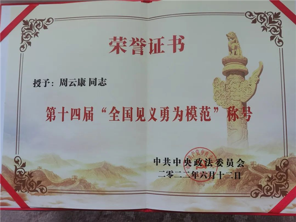 獲此殊榮,周云康感到十分激動,他說:“在人民群眾有生命危險時,見義勇為,挺身而出,是自己的本能,很榮幸能受到國家表彰,國家和人民給了自己這么高的榮譽,作為一名志愿者,今后將不忘初心,繼續(xù)傳遞見義勇為的正能量,帶動更多的人,積極主動投身見義勇為的行列之中,為平安安康做出貢獻(xiàn)。”