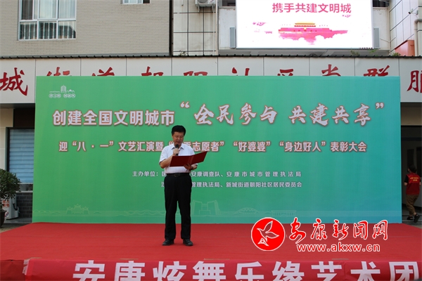 本網(wǎng)訊(通訊員 趙小玉 譚成鈴)為扎實(shí)推進(jìn)全國(guó)文明城市創(chuàng)建工作,營(yíng)造“全民參與,共建共享”的濃厚氛圍,進(jìn)一步掀起幫扶社區(qū)的創(chuàng)文工作熱潮,8月1日晚,國(guó)家統(tǒng)計(jì)局安康調(diào)查隊(duì)聯(lián)合市、區(qū)城市管理執(zhí)法局、朝陽社區(qū)居委會(huì)共同舉辦了朝陽社區(qū)“創(chuàng)建文明城市‘全民參與,共建共享’”迎“八一”文藝匯演暨“優(yōu)秀志愿者”“好婆婆”“身邊好人”表彰活動(dòng)。市人大常委會(huì)黨組成員、副主任趙立根出席活動(dòng)并講話。