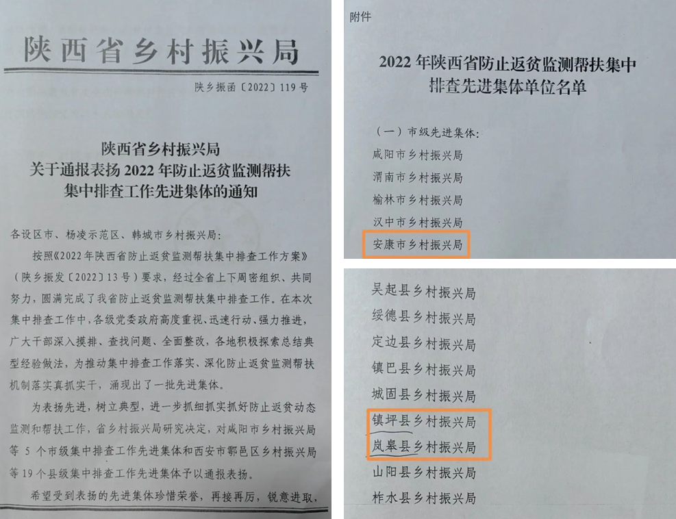 在8月5日陜西省鄉(xiāng)村振興局《關(guān)于通報表揚2022年防止返貧監(jiān)測幫扶集中排查工作先進集體的通知》中,我市鄉(xiāng)村振興局和嵐皋、鎮(zhèn)坪鄉(xiāng)村振興局獲得先進集體的通報表揚。