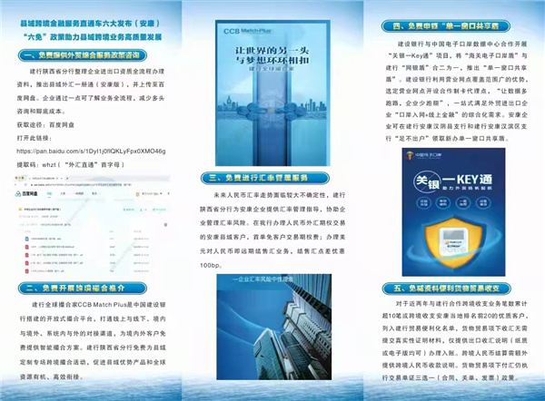 會(huì)上,中國(guó)建設(shè)銀行陜西分行相關(guān)負(fù)責(zé)人就縣域跨境金融服務(wù)直通車的模式、六免政策、外貿(mào)企業(yè)線上跨境金融產(chǎn)品進(jìn)行了介紹。
