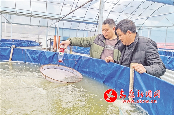 在石泉縣城關(guān)鎮(zhèn)楊柳社區(qū)高密度水產(chǎn)養(yǎng)殖基地,技術(shù)人員正在耐心查看南美對(duì)蝦生長情況。董長松 攝