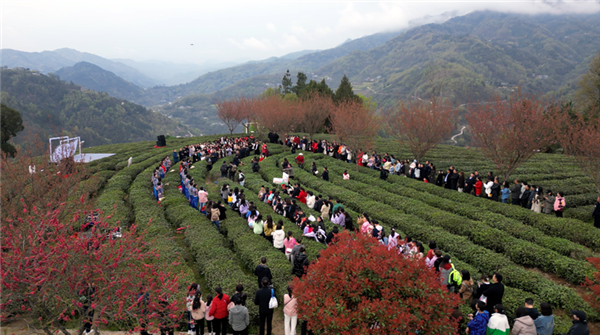 “三月三哪,上茶山喲依兒呦,姐妹采茶呀心喜歡哪,喲依兒?jiǎn)眩缴斤h清香,處處好茶園”。3月26日,在安康市紫陽(yáng)縣向陽(yáng)鎮(zhèn)富硒茶觀光園里正在開(kāi)展“千人對(duì)歌”活動(dòng),歌聲悠揚(yáng)婉轉(zhuǎn),吸引了不少游客前來(lái)聽(tīng)民歌、賞茶園。