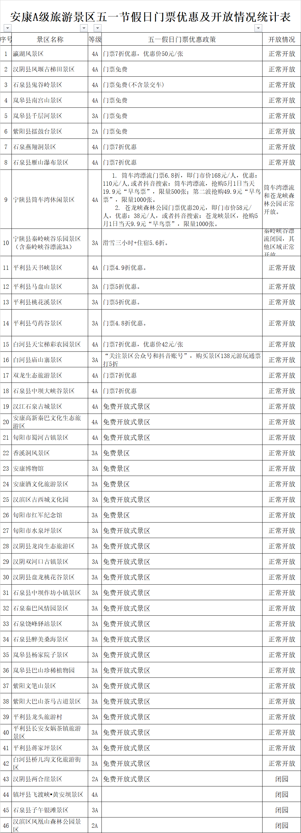 13家收費(fèi)景區(qū)推出門(mén)票打折優(yōu)惠活動(dòng):瀛湖風(fēng)景區(qū)推出“五一”期間門(mén)票7折優(yōu)惠,優(yōu)惠價(jià)50元/張;石泉燕翔洞景區(qū)、石泉縣雁山瀑布景區(qū)、石泉縣中壩大峽谷景區(qū)推出“五一”期間門(mén)票七折優(yōu)惠;雙龍生態(tài)旅游景區(qū)推出“五一”期間門(mén)票7折優(yōu)惠;平利縣天書(shū)峽景區(qū)推出“五一”期間門(mén)票4.9折優(yōu)惠;白河縣天寶梯彩農(nóng)園景區(qū)推出“五一”期間門(mén)票7折優(yōu)惠,優(yōu)惠價(jià)42元/張;平利縣馬盤(pán)山景區(qū)推出“五一”期間門(mén)票5折優(yōu)惠;平利縣桃花溪景區(qū)推出“五一”期間門(mén)票5折優(yōu)惠;平利縣芍藥谷景區(qū)推出“五一”期間門(mén)票4.8折優(yōu)惠。