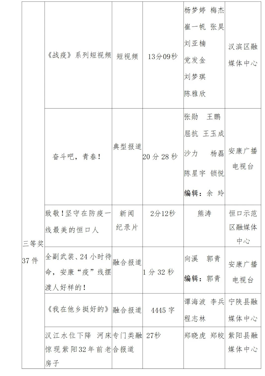 2022年度安康新聞獎(jiǎng)評(píng)審工作在中共安康市委宣傳部的指導(dǎo)下,由市記協(xié)具體組織實(shí)施,經(jīng)過各申報(bào)單位推薦、初審,市記協(xié)復(fù)審并組織專家定評(píng),評(píng)選出擬獲安康新聞獎(jiǎng)作品96件,其中一等獎(jiǎng)23件、二等獎(jiǎng)36件、三等獎(jiǎng)37件。擬授予姚登等14名同志“安康市優(yōu)秀新聞工作者”榮譽(yù)稱號(hào)。