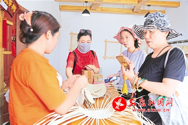 “一扇天下”的女主人叫李宗琴,作坊里有編制的螞蚱、蝎子、竹蜻蜓、竹簍、棕扇等,就連店里的微信收款二維碼也是編制而成。李宗琴是中壩村人,出嫁外地后,聽說(shuō)村里建成作坊小鎮(zhèn),返鄉(xiāng)辦起手工編織作坊。自己編棕扇的同時(shí),她還把手藝無(wú)償傳授給鄉(xiāng)親們,鄉(xiāng)親們編好后,她回收銷售,既傳承了手藝,也為鄉(xiāng)親們拓寬了增收的新路子。