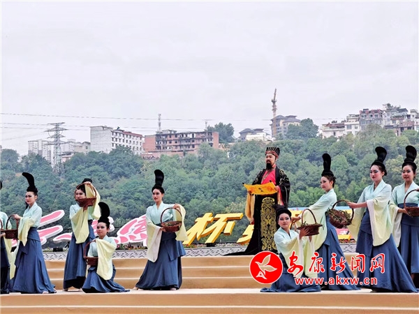 悠悠古琴聲中,青衣女子們手提竹籃蹁躚而來。“緬懷先賢”,主祭官一聲令下,全場矚目中,9位大漢護送屈原像至舞臺中央,開幕式翻開祭祀篇章。主祭官走向高臺仰頸高呼:“詠頌祭文……”百名身著漢服、手持竹簡的孩童齊聲詠頌,頓挫抑揚,激蕩云霄。“萬民歡慶歌盛世,安瀾裕阜唱安康。”典禮儀成,青衣女子們“兵分兩列”,一列把竹籃里面的粽子拋向江中,追念先賢,一列繞場為現(xiàn)場觀眾贈發(fā)香包,送上幸福安康的祝福。