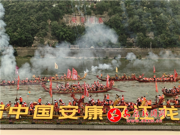 渾厚雄壯的“喊江調(diào)子”中,江面28艘龍舟抖擻精神、踏浪而來,江岸健身龍表演同步登場,朝氣蓬勃。歌舞《安安康康鬧龍舟》、陜南民歌聯(lián)唱《漢水歡歌》、龍舟橫渡、健身操《活力安康》配合摩托艇“水上飛人”、傳統(tǒng)漢劇《漢江上傳唱著漢調(diào)二黃》等精彩節(jié)目輪番上演,搶鴨子摸鯉魚、民俗舞蹈《方寸之間》等安康特有民俗節(jié)目將現(xiàn)場氛圍推上一輪又一輪高潮。最終,開幕式在歌舞《幸福安康》中圓滿落下帷幕。