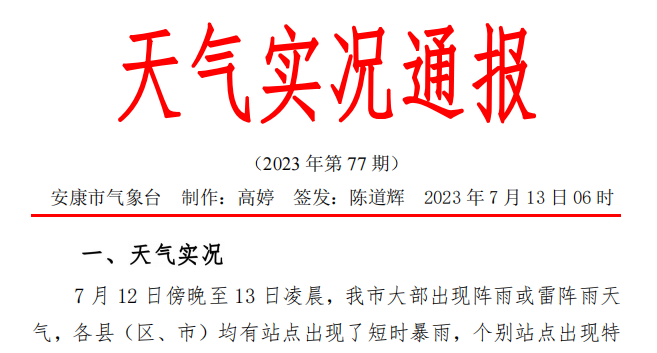 7月12日傍晚至13日凌晨,我市大部出現(xiàn)陣雨或雷陣雨天氣,各縣(區(qū)、市)均有站點(diǎn)出現(xiàn)了短時(shí)暴雨,個(gè)別站點(diǎn)出現(xiàn)特大暴雨(≥50毫米/小時(shí)),部分地區(qū)出現(xiàn)了6—8級(jí)短時(shí)大風(fēng)和強(qiáng)雷電。據(jù)統(tǒng)計(jì),過去12小時(shí)(2023年7月12日18時(shí)至7月13日06時(shí))全市共有191個(gè)氣象監(jiān)測(cè)站出現(xiàn)了降雨,累計(jì)降水量5毫米(中雨)以上有138站,15毫米(大雨)以上有94站,30毫米(暴雨)以上有47站,70毫米(大暴雨)以上有3站,其中單站雨量最大為漢濱區(qū)洪山蒿坡氣象監(jiān)測(cè)站102.8毫米,最大小時(shí)雨強(qiáng)出現(xiàn)在漢濱區(qū)洪山蒿坡72.6毫米(7月12日22時(shí)-23時(shí))。安康城區(qū)氣象監(jiān)測(cè)站38.6毫米。