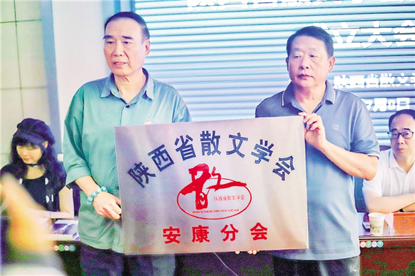 中國(guó)散文學(xué)會(huì)副會(huì)長(zhǎng)、陜西省散文學(xué)會(huì)會(huì)長(zhǎng)陳長(zhǎng)吟向省散文學(xué)會(huì)安康分會(huì)會(huì)長(zhǎng)李煥龍授牌。