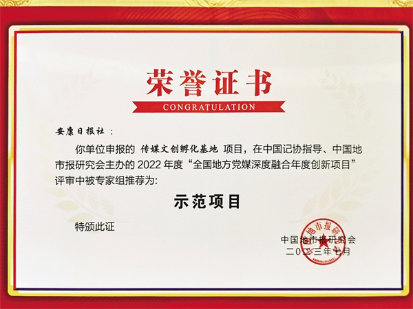 7月9日,全國地市媒體全媒體傳播體系建設(shè)推進大會在內(nèi)蒙古烏蘭浩特市舉行。會上,對第二屆全國地方黨媒融合發(fā)展創(chuàng)新項目進行了表彰,安康日報社的《傳媒文創(chuàng)孵化基地》獲“示范項目”大獎,此獎項陜西共兩家媒體通過評審獲獎。