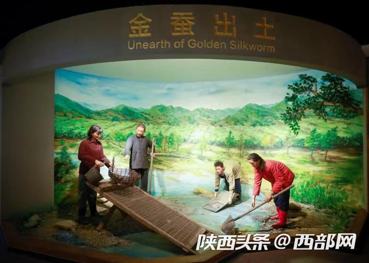 “和很多珍貴文物一樣,這條‘鎏金銅蠶’也是發(fā)現(xiàn)于不經(jīng)意間。”金蠶之鄉(xiāng)展覽館講解員向媒體采訪團(tuán)介紹了那段歷史——1984年,石泉縣池河流域譚家灣農(nóng)民譚福全,在河水中淘金時(shí),發(fā)現(xiàn)一條金光燦燦的金蠶。這只蠶通長5.6厘米,胸圍1.9厘米,胸高1.8厘米,首尾9個(gè)腹節(jié),體態(tài)逼真。此種鎏金蠶是迄今國內(nèi)首次發(fā)現(xiàn)的,經(jīng)專家鑒定為國家一級(jí)文物,它是西漢時(shí)期皇帝褒獎(jiǎng)蠶桑生產(chǎn)的“御賜獎(jiǎng)品”,非常珍貴。