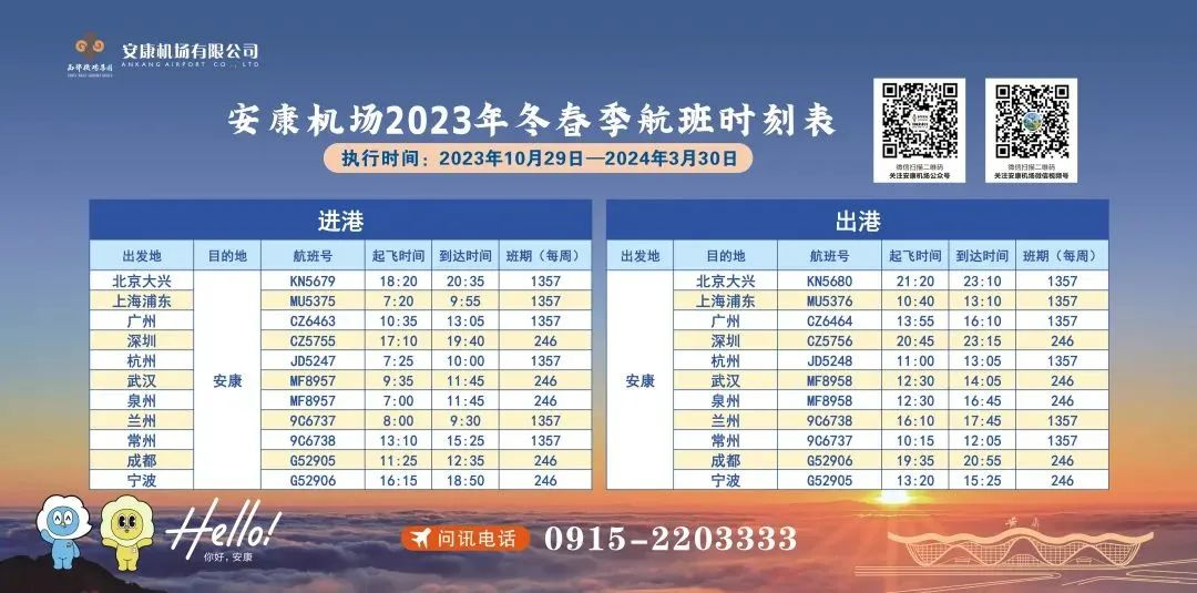 2023年10月29日至2024年3月30日,安康機(jī)場將正式執(zhí)行冬春季航班計劃。航班計劃共8條航線,通航國內(nèi)11座城市,分別為: