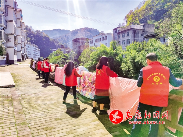 紫陽(yáng)縣高橋鎮(zhèn)桂花樹(shù)社區(qū)組織新時(shí)代文明實(shí)踐志愿者服務(wù)隊(duì),幫助社區(qū)行動(dòng)不便的獨(dú)居老人、殘疾人曬被子、裝過(guò)冬棉被。胡波 王順勤 攝