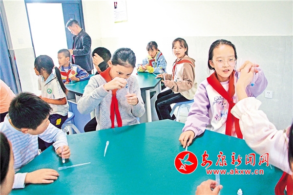 老縣鎮(zhèn)中心小學學生動手體驗酸堿中和實驗。 吳風軍 攝