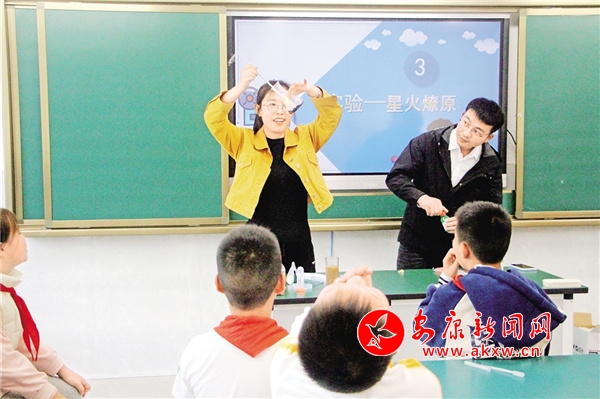 安康學院化學化工學院青年教師王雪博士、金成召博士為學生演示木棒復(fù)燃實驗。 吳風軍 攝